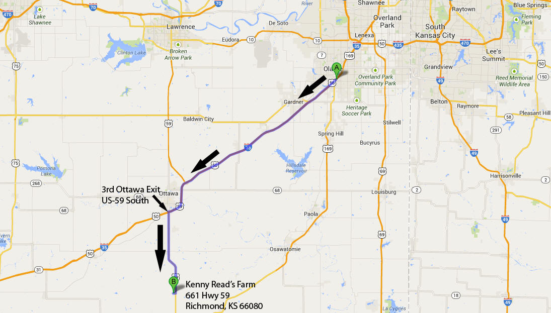 Olathe, KS: Follow 1-35 South to the 3rd Ottawa Exit #183. Take US-59 South